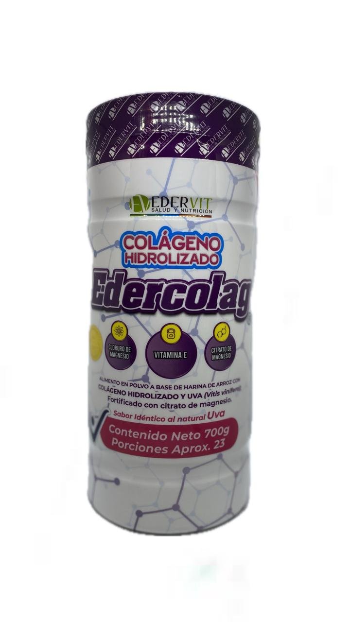 Edercolag es un alimento en polvo a base de harina de arroz con colágeno hidrolizado y uva, fortificado con citrato de magnesio, cloruro de magnesio y vitamina E, diseñado para la salud de la piel, articulaciones, uñas y cabello.