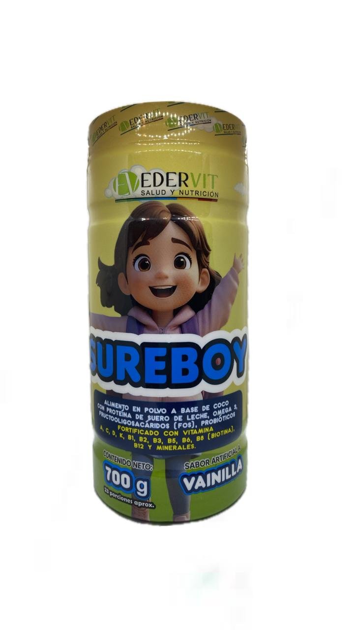 Ureboy de Vedervit es un alimento en polvo con sabor artificial a vainilla, presentado en un envase cilíndrico de 700g que rinde aproximadamente 23 porciones. Su formulación se basa en coco y contiene proteína de suero de leche, omega 3, fructooligosacáridos (FOS) como prebióticos, y probióticos. Además, está enriquecido con una variedad de vitaminas (A, C, D, K, B1, B2, B3, B5, B6, B8 (Biotina), B12) y minerales, diseñado para la salud y nutrición.