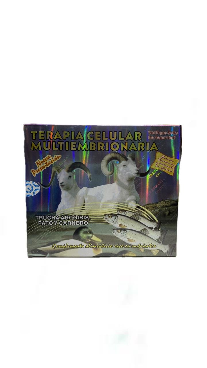 Terapia Celular Multiembrionaria es un suplemento nutricional presentado en un empaque holográfico con imágenes de cabras, peces (trucha arcoíris) y un pato. El producto se anuncia como una “Terapia Celular Multiembrionaria” y un “Complemento alimenticio rico en nutrientes” que incorpora trucha arcoíris, pato y carnero. También menciona la inclusión de “Glucosamina y Factores de Transferencia” y destaca la importancia de verificar el sello de seguridad. Este tipo de productos suelen ser promocionados para la regeneración celular y con supuestas propiedades en salud, preventivas, curativas o terapéuticas.